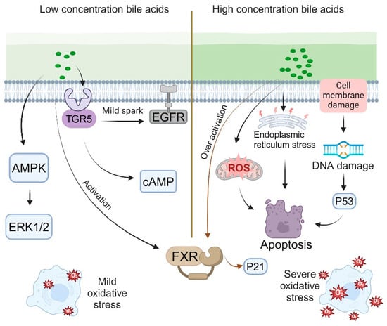 When bile acid concentrations surpass a specific threshold, their influence on cellular proliferation shifts to an inhibitory effect [81]. Elevated bile acid levels can directly inflict damage on cell membranes and DNA [82]. Such DNA damage may activate the p53 pathway, resulting in cell cycle arrest or apoptosis [83]. Additionally, high bile acid concentrations markedly increase the production of reactive oxygen species (ROS), culminating in severe oxidative stress [83,84]. This excessive oxidative stress can impair organelle function and trigger apoptotic pathways [83,85]. Furthermore, elevated bile acid levels induce endoplasmic reticulum (ER) stress and activate the unfolded protein response (UPR) [86,87,88]. Prolonged ER stress may also result in cell cycle arrest and apoptosis [89]. Mitochondrial dysfunction, another consequence of high bile acid concentrations, can lead to disruptions in energy metabolism and cell death [86,90]. Moreover, excessive bile acid concentrations excessively activate the FXR and upregulate the expression of cell cycle inhibitory factors such as p21 [35,91] (Figure 2, right).