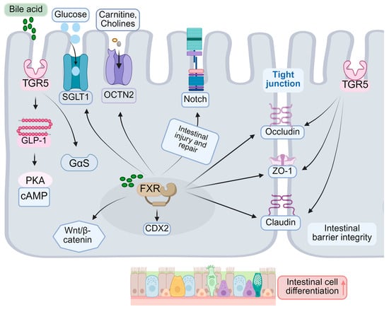 Bile acid receptors primarily encompass the farnesoid X receptor (FXR), the vitamin D receptor (VDR), the pregnane X receptor (PXR), constitutive androstane receptor (CAR), the G protein-coupled bile acid receptor (TGR5), sphingosine-1-phosphate receptor 2 (S1PR2), Mas-related G protein-coupled receptor X4 (MRGPRX4), etc. [30]. The expression patterns of these receptors differ across various intestinal segments and cell types, contributing to a complex signaling network. Bile acids and their receptors are integral in regulating intestinal absorption, signal transduction, cell proliferation and repair, cellular senescence, immune responses, energy metabolism, and the microbiota within intestinal epithelial cells. Among these, FXR and TGR5 are the predominant receptors expressed in intestinal epithelial cells. They are key regulatory factors in bile acid metabolism, innate immunity, energy metabolism, and inflammatory response. Therefore, this review will examine the diverse effects of bile acids and these two receptors on epithelial cells.