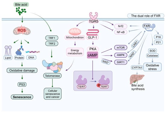 The activation of the FXR indirectly modulates the expression of telomerase reverse transcriptase (TERT), primarily by influencing the activity of specific transcription factors. As a nuclear receptor, FXR is implicated in the regulation of various metabolic processes, including those related to bile acid, lipid, and glucose metabolism [192]. Scholars have conducted research indicating that FXR activation impacts hepatic and intestinal metabolism also plays a crucial role in cellular proliferation and survival [193]. Furthermore, FXR indirectly influences telomerase activity and assembly by modulating genes associated with the cell cycle and proliferation [194]. Recent research has highlighted the significance of the TGR5 in numerous physiological and pathological processes, such as metabolic diseases, inflammatory responses, and hepatic disorders [195]. Activation of TGR5 indirectly affects the phosphorylation and activity of TERT via the cAMP-PKA signaling pathway [68,196]. Additionally, TGR5 can modulate telomerase activity by altering the cellular energy metabolism state [195,197] (Figure 4).
