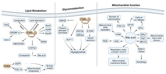 The impact of bile acids and their corresponding receptors on glucose and lipid metabolism, as well as mitochondrial function.