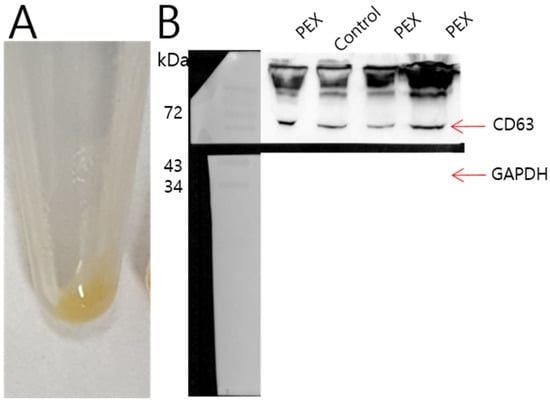 Plasma samples collected from PEX patients and control subjects were defibrinated to obtain supernatants (sera). Using an Exoquick-TC kit, the collected sera were centrifuged. Each supernatant was mixed with an exosome precipitation solution, incubated 30 min for serum at 4 °C, and centrifuged to obtain exosomes with beige or white pellet at the bottom (Figure 1A). The exosome pellet was collected and resuspended using phosphate-buffered saline (PBS). To confirm that the exosome pellet contained tetraspanin, CD63 Western blot analysis was performed. Both exosomes from the control and PEX patients showed CD63 expression. However, PEX patients tended to have higher expression levels of CD63 than control subjects. GAPDH, a negative control for exosomes, showed complete negative expression in exosomes collected from control subjects or PEX patients (Figure 1B and Figure S1).