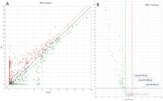 Scatter and volcano plot of miRNA expression in plasma samples from pseudoexfoliation glaucoma patients compared to the controls. (A) Upregulated miRNAs are visualized in the upper region of the scatter plot (red), and downregulated miRNAs are visualized in the lower region of the scatter plot (green). (B) In the volcano plot, upregulated miRNAs are shown in the right of the plot (red). Downregulated miRNAs are visualized in the left of the plot (green). The volcano plot shows three significantly upregulated miRNAs (hsa-miR-92b-5p, hsa-miR-744-5p, hsa-miR-148b-3p) compared to the control with fold change > 2 and p-value < 0.05.