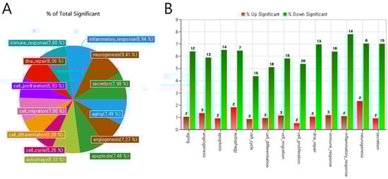 GO categories of miRNAs in exosomes with relatively large expression changes were identified in PEX glaucoma. GO categories related to neurogenesis (9.41%) had the greatest portion, including both upregulation and downregulation. Categories of inflammatory response (8.94%), DNA repair (8.60%), secretion (8.45%), and autophagy (8.33%) also presented significant proportions (Figure 3A).
