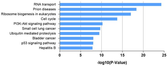 The leading KEGG pathways, which include the predicted gene targets of each miRNA, are demonstrated in Table 3. The three most significantly enriched pathways, ranked by enrichment score (−log10 p-value), were RNA transport (24.30), prion diseases (18.35), and ribosome biogenesis in eukaryotes (17.02), respectively. Among these, the RNA transport pathway exhibited the most significant association with significantly differentially expressed miRNA from exosome in patients with PEX glaucoma in the KEGG pathway analysis (Figure 4).