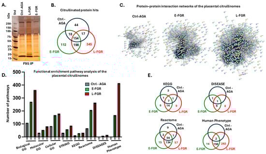 Citrullinated proteins isolated from the control and FGR placental samples. (A) A silver-stained protein gel (4–20% TGX gel) showing the pan-citrulline (F95) enriched protein fractions isolated from the three placental groups: control (Ctrl-AGA), late-onset FGR (L-FGR) and early-onset FGR (E-FGR), respectively. (B) A Venn diagram summarising the citrullinated protein hits which were identified by LC-MS/MS; shared and unique protein hits are shown for the control and FGR groups (for a full list of protein hits, see Supplementary Table S1). (C) Protein–protein interaction (PPI) networks of the placental citrullinomes with individual protein hits represented by the coloured nodes: Ctrl-AGA group (160 nodes, 947 edges); E-FGR group (335 nodes, 3834 edges); L-FGR group (545 nodes, 4771 edges). PPI enrichment p-value < 1.0 × 10−16 for all. (D) Functional enrichment pathway analysis for the placental citrullinomes, comparing control (AGA) and FGR placental samples. The graph compares total numbers of citrullinome-associated pathways identified per group (control, E-FGR, L-FGR), with respect to Biological GO, Molecular GO, Cellular GO, STRING cluster, KEGG, Reactome, DISEASES and Human Phenotype pathways. (E) The Venn diagrams summarise shared and unique KEGG, Reactome, DISEASE and Human Phenotype pathways for the citrullinomes of control, E-FGR and L-FGR placental samples. (For full details on the KEGG and DISEASE pathways, see Supplementary Table S2; for Human Phenotypes, see Supplementary Table S3; for Reactome pathways, see Supplementary Table S4).