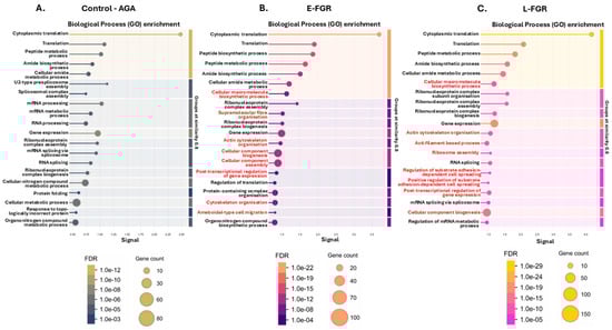 Biological Process (GO) enrichment pathways for the placental citrullinomes. For each group the top 20 pathways are shown: (A) control (AGA) placental citrullinome; (B) early-onset FGR placental citrullinome; (C) late-onset FGR placental citrullinome. The graphs show Signal on the x-axis and false discovery rate (FDR) on the y-axis. Gene count indicates number of proteins associated with the term. Red highlighted terms are unique to the top 20 terms identified for the FGR groups. The red highlighted terms are unique to the respective group.