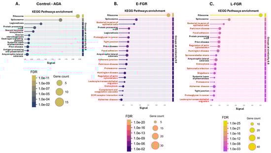 KEGG enrichment pathways. For each group, the top pathways are shown. (A) Control (AGA) placental citrullinome had 11 associated KEGG pathways. (B) The 20 top KEGG pathways for the early-onset FGR placental citrullinome. (C) The 20 top KEGG pathways for the late-onset FGR placental citrullinome. The graphs show Signal on the x-axis and false discovery rate (FDR) on the y-axis. Gene count indicates number of proteins associated with the term. The red highlighted terms are unique to the respective group.