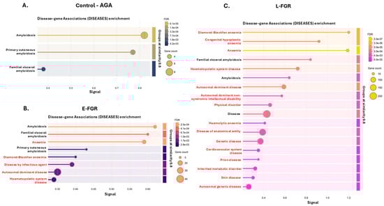 Disease–gene associations (DISEASES) enrichment. In the control group (A), three DISEASES pathways were associated with the placental citrullinome, eight pathways were identified for the E-FGR (B) and 18 pathways for the L-FGR (C) placental citrullinomes. The graphs show Signal on the x-axis and false discovery rate (FDR) on the y-axis. Gene count indicates number of proteins associated with the term. The red highlighted terms are unique to the respective group.