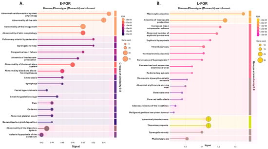 Top 20 Human Phenotype pathways associated with the placental citrullinome of the two FGR groups (A) E-FGR and (B) L-FGR; none were associated with the control group. The graphs show Signal on the x-axis and false discovery rate (FDR) on the y-axis. Gene count indicates number of proteins associated with the term.