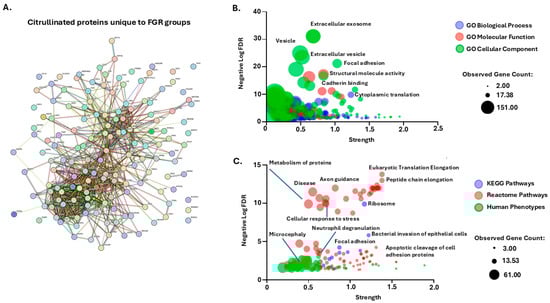 Citrullinated proteins associated with the FGR groups only but not identified in the control (AGA) placentas. (A) Protein–protein interaction network (151 nodes, 470 edges, PPI enrichment p-value < 1.0 × 10−16). (B) Enriched GO pathways showing Biological Process, Molecular Function and Cellular Component, with some of the highest enriched terms annotated. (C) KEGG and Reactome pathways, alongside Human Phenotype (Monarch) pathways, with selected annotations highlighting some of the top terms identified, based on FDR and strength.