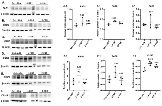 PAD isozyme protein levels and citrullinated histone H3 (CitH3) were assessed by Western blotting comparing appropriate-to-gestational-age (AGA) control and FGR placental samples. (A–E) Protein detection of PAD1,2,3,4 and 6 is presented, compared with β-actin loading control. (F) Histone H3 citrullination (CitH3) is shown in the same samples, compared with β-actin loading control. For each group, 3 × 3 samples were pooled per lane. (A.1–F.1) Protein densitometry was performed relative to β-actin and is shown in the graphs. Significance was considered at p ≤ 0.05; exact p-values are shown. Control (Ctrl-AGA), late-onset FGR (L-FGR), early-onset FGR (E-FGR).