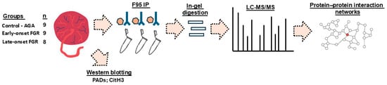 Overview of the experimental setup. Placental samples from control (AGA), early-onset and late-onset FGR groups were used for protein isolation. Proteins were assessed by Western blotting, and immunoprecipitation of citrullinated proteins was carried out with the pan-citrulline F95 antibody. Citrullinated protein fractions were subjected to in-gel digestion and protein hits were identified by LC-MS/MS analysis. The placental citrullinomes were then assessed for protein–protein interaction networks and associated functional enrichment pathway analysis.