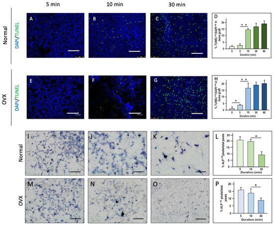 Cell viability, apoptosis, and ALP activity in normal and osteoporotic bone grafts at 23 °C. Live/dead staining was performed on normal (A–C) and osteoporotic (E–G) bone grafts at 5, 10, and 30 min. Scale bar = 150 μm. Apoptotic cell percentages at 0, 5, 10, 30, and 60 min are shown in bar charts (D,H), based on TUNEL and DAPI staining. Representative ALP staining images of normal (I–K) and osteoporotic (M–O) bone grafts at 0, 10, and 30 min. Scale bar = 200 μm. Bar charts (L,P) show ALP-positive pixel quantification at these time points. * p < 0.05–0.01 ** p < 0.01–0.001.