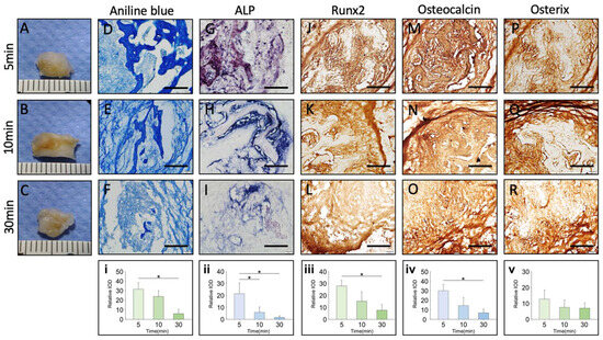 Immunohistochemical staining of subcutaneous implantation of bone graft in nude mice at postoperative day 21 (PID21). Bone grafts handled at 23 °C for different durations were assessed. Gross Images: Bone grafts after graft handling for 5, 10, and 30 min (A–C). Scale bar = 1 mm. Aniline blue staining for grafts handled for 5, 10, and 30 min (D–F). ALP Staining for grafts handled for 5, 10, and 30 min (G–I). RUNX2 Staining for grafts handled for 5, 10, and 30 min (J–L). Osteocalcin staining for grafts handled for 5, 10, and 30 min (M–O). Osterix staining for grafts handled for 5, 10, and 30 min (P–R). Scale bar = 300 μm. Bar charts (i–v) quantify staining intensity of RUNX2, Osteocalcin, and Osterix in grafts handled for 5, 10, and 30 min. * p < 0.05–0.01.