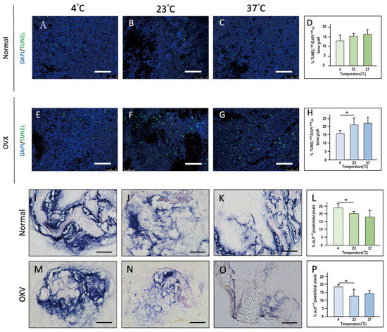 Cell Viability, Apoptosis, and ALP Activity in Normal and Osteoporotic Bone Grafts at Different Temperatures. Live/Dead Cell Staining: Normal (A–C) and osteoporotic (E–G) bone grafts handled for 10 min at 4 °C, 23 °C, and 37 °C. Scale bar = 150 μm. Apoptotic cell percentages are shown in bar charts (D,H) based on TUNEL and DAPI staining. Alkaline Phosphatase (ALP) Staining at PID21: Representative ALP staining of normal (I–K) and osteoporotic (M–O) bone grafts stored at 4 °C, 23 °C, and 37 °C. Scale bar = 300 μm. Bar charts (L,P) quantify ALP-positive pixels relative to total pixels. * p < 0.05–0.01.