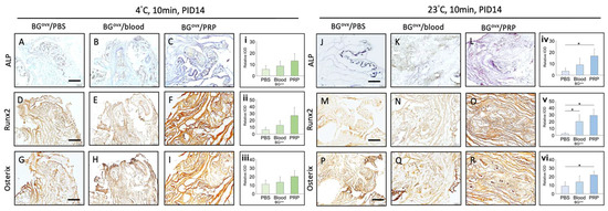 IHC Staining of subcutaneous implantation of osteoporotic bone graft in nude mice at 4 °C and 23 °C after 10 min. ALP Staining: Osteoporotic bone grafts handled in PBS, blood, and PRP at 4 °C (A–C) and 23 °C (J–L). Runx2 Staining: Osteoporotic bone grafts handled in PBS, blood, and PRP at 4 °C (D–F) and 23 °C (M–O). Osterix Staining: Osteoporotic bone grafts handled in PBS, blood, and PRP at 4 °C (G–I) and 23 °C (P–R). Scale bar = 200 μm. Bar charts (i–vi) quantify staining intensity of ALP, Runx2, and Osterix expression in bone grafts preserved in PBS, blood, and PRP at PID 14. * p < 0.05–0.01.