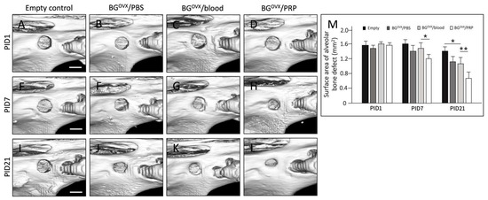 Micro-CT Analysis of Osteoporotic Rat Alveolar Defects at Different Post-Implantation Days. Representative micro-CT images of osteoporotic rat alveolar defects at post-implantation day (PID 1 (A–D), PID 7 (E–H), and PID 21 (I–L)), following bone grafting with different treatments: no solution (empty control), PBS, blood, and PRP (all handled for 10 min at 23 °C). Scale bar = 2 mm. Bar chart (M) showing alveolar defect surface area (mm2) over time (PID 1, 7, and 21) for each treatment condition. * p < 0.05–0.01 ** p < 0.01–0.001.