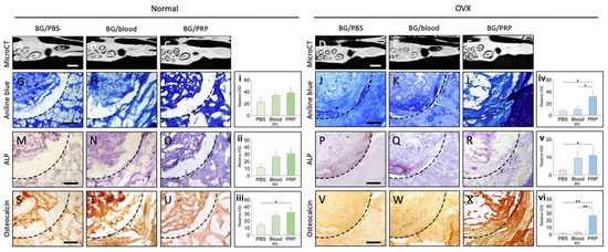 Comparison of Normal vs. Osteoporotic Bone Grafts in Normal and Osteoporotic Rat Alveolar Defects at Post-Implantation Day 21 (PID 21) with Different Solutions. Representative micro-CT images (A–F) of normal and osteoporotic rat alveolar defects at PID 21, with bone grafts handled in PBS, blood, or PRP for 10 min at 23 °C. Scale bar = 2 mm. Representative aniline blue staining (G–L) illustrating collagen deposition, ALP staining (M–R) indicating osteoblastic activity, and osteocalcin staining (S–X) showing late-stage bone formation in both normal and osteoporotic rats. Scale bar = 200 μm. Quantitative bar chart analysis of immunohistochemical staining comparing normal (i–iii) and osteoporotic (iv–vi) bone grafts preserved in PBS, blood, and PRP at PID 21. * p < 0.05–0.01 ** p < 0.01–0.001.