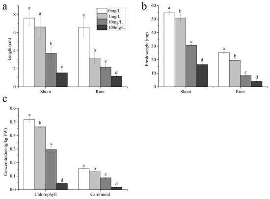 Morphological characteristics: (a) length; (b) fresh weight; (c) photosynthetic pigment. Different lowercase letters indicate significant differences found with the one-way ANOVA (LSD) (p < 0.05).