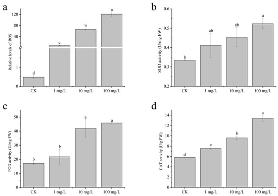 ROS and antioxidant enzyme responses: (a) ROS level; (b) SOD activity; (c) POD activity; (d) CAT activity. Statistical analysis with one-way ANOVA (ROS: LSD; other indicators: Dunnett’s) (p < 0.05) revealed significant variations among treatments, as indicated by different lowercase letters.