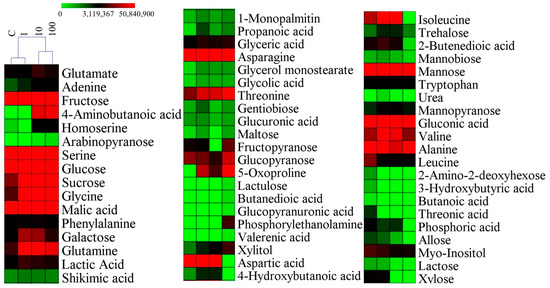 The relative contents of metabolites. MeV 4.9.0 software (Hierarchical Clustering) to data visualization. C = control (0 mg/L).