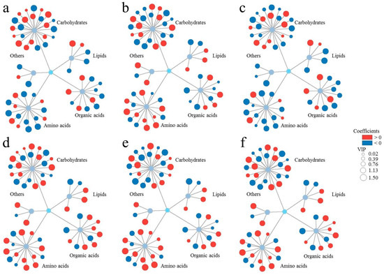 The comprehensive relationships between metabolic profiles and biological endpoints ((a): root fresh weight, (b): ROS level, (c): root length, (d): SOD activity, (e): POD activity, (f): CAT activity). SIMCA 14.1 software (Orthogonal Partial Least Square) for cluster analysis. Cytoscape 3.9.1 software to data visualization.