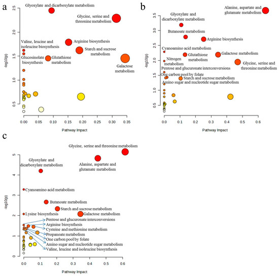 Differential metabolic pathways between control and sulfamethoxazole treatments: (a) C vs. 1 mg/L; (b) C vs. 10 mg/L; (c) C vs. 100 mg/L. C = control (0 mg/L). MetaboAnalyst 6.0 software (Fisher’s Exact Test) for differential metabolic pathways.