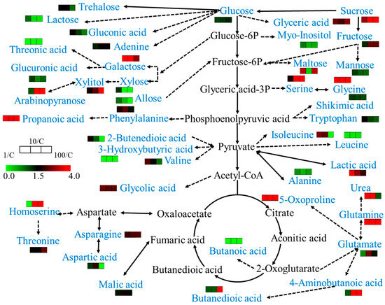 A metabolomic analysis revealed that root fresh weight, root length, ROS content, SOD, POD, and CAT activities served as a sensitive phenotypic indicator of SMX exposure. In addition, metabolomics technology was used to investigate the changes in the metabolites in plants. Specifically, we used gas chromatography and mass spectrometry to thoroughly analyze each sample and identified 58 metabolites [13]. Significant alterations were observed across multiple metabolite classes, particularly amino acids and organic acids (Figure 3). Hierarchical clustering classified the metabolic profiles into two distinct clusters, (1) control (C) and 1 mg/L SMX treatments and (2) 10 mg/L and 100 mg/L SMX treatments, suggesting a dose-dependent metabolic shift. The results show that high concentration of sulfamethoxazole could significantly change the internal metabolic activity of wheat cells. To systematically characterize stress-responsive metabolites, we employed a Venn diagram approach to identify both conserved and treatment-specific metabolic signatures across all experimental groups (C, 1, 10, and 100 mg/L SMX) (Figure S2). The four groups contained a total of 37 common components, of which the C and 100 mg/L groups each had 4 unique components.