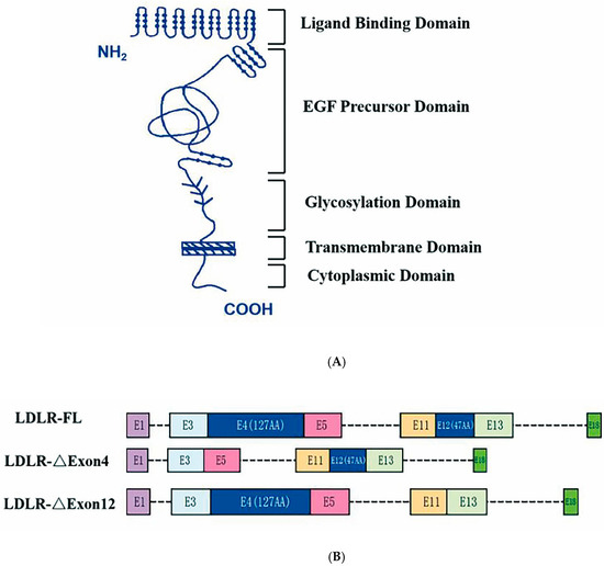 Sketch of low-density lipoprotein receptor structural domains and mRNA. Panel (A): Five structural protein domains of human low-density lipoprotein receptor (LDLR)—ligand binding structural domain (encoded by exons 2–6), epidermal growth factor (EGF) precursor domain (encoded by exons 7–14), glycosylated domain (encoded by exons 15), a transmembrane domain (encoded by exons 16 and 17), and a cytoplasmic domain (encoded by partial sequences of exons 17 and 18). Morphological changes in LDLR associated with ΔExon4 and ΔExon12 cause functional impairment of the ligand binding domain and EGF precursor domain, respectively. Panel (B): LDLR full length (FL) of human leukocyte with E1 to E18 exons and 17 introns, and the splicing isoform of LDLR-∆Exon4 and LDLR-∆Exon12, respectively.