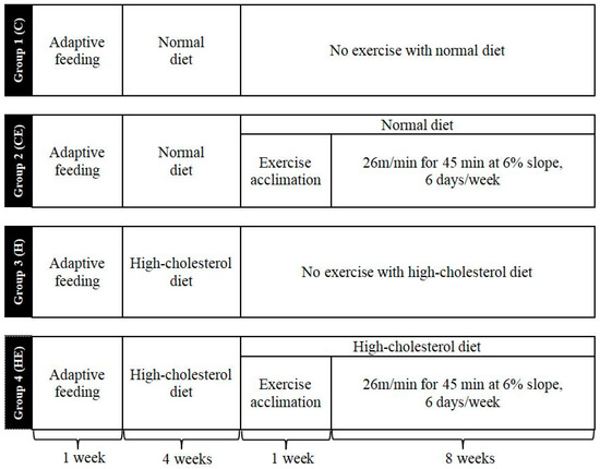 Overview of the experiment protocol for mice. Group 1 or C: control group (i.e., normal diet); Group 2 or CE: control with exercise training for 8 weeks; Group 3 or H: high-cholesterol diet for 13 weeks; Group 4 or HE: high-cholesterol diet combined with exercise training. Eight-week treadmill exercise training started after 4-week high-cholesterol diet and 1-week exercise phase-in with high-cholesterol diet for Group 4 (HE group). The animals were euthanized after 24 h fasting from the last day of the protocols.