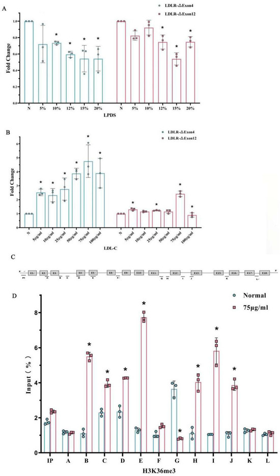 Based on the in vitro high-cholesterol cell model (Figure 4B), HepG2 cells were cultured by adding 75 μg/mL LDL-C to explore the association of high cholesterol with histone modifications and the potential causal role of histone modifications in LDLR pre-mRNA alternative splicing. CHIP analysis was used to map a set of histone modifications across the alternatively spliced region in LDLR and to compare the differences between adding LDL-C 75 μg/mL (H) and the normal (N), i.e., control condition (normal = 0 LDL-C). Enriched plasma cholesterol with an addition of 75 μg/mL LDL-C remarkably changed the histone modifications around exon 4 and exon 12 of LDLR (Figure 4C,D). The levels of H3-K36me3 were distinctly enriched around the LDLR exon 4 and 12 as compared to the control or normal group. These results seemed to agree with the mouse data; that H3-K36me3 with the alternative exon around the region was augmented in association with hyperlipidemia following a 13-week high-cholesterol diet (Figure 3).