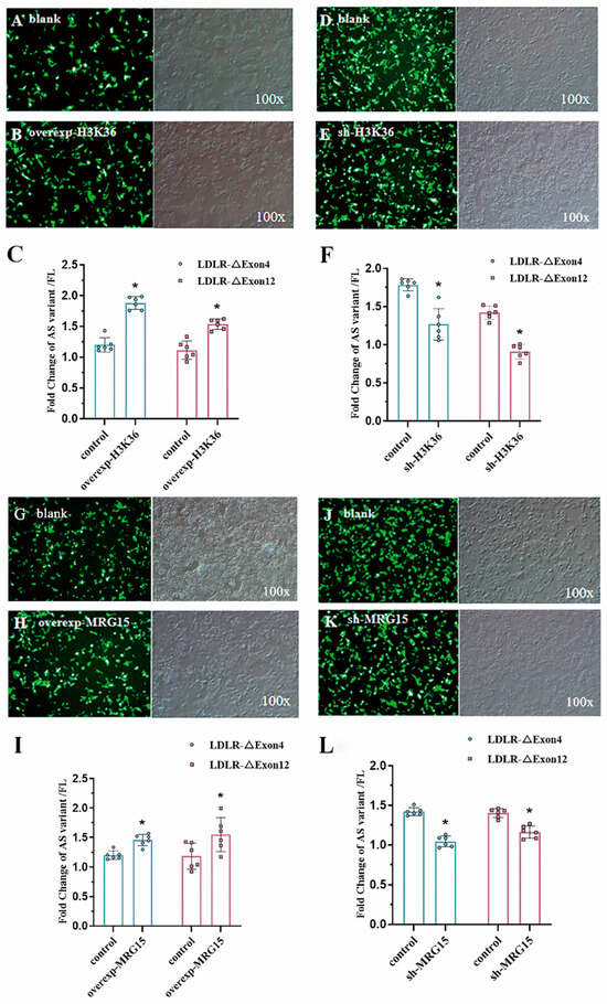 H3K36me3 and MRG15 regulated alternative splicing of LDLR pre-mRNA. Transfection effect of H3K36 methyltransferase overexpression (100×) blank plasmid (Panel (A)) vs. overexpression plasmid (Panel (B)) on the splicing efficiency of LDLR-∆Exon4 and LDLR-∆Exon12 (Panel (C)) in HepG2 cells. Both LDLR-∆Exon4 and LDLR-∆Exon12 were significantly augmented with the overexpressed H3K36 methyltransferase plasmid based on two-tailed Student’s t-test. The effect of H3K36 methyltransferase interference (100×) blank plasmid (Panel (D)) vs. interference plasmid (Panel (E)) on the splicing efficiency of LDLR-∆Exon4 and LDLR-∆Exon12 (Panel (F)) in HepG2 cells. Both LDLR-∆Exon4 and LDLR-∆Exon12 were significantly reduced with the interfered plasmid based on two-tailed Student’s t-test. Transfection effect of MRG15 methyltransferase overexpression (100×) blank plasmid (Panel (G)) vs. overexpression plasmid (Panel (H)) on the splicing efficiency of LDLR-∆Exon4 and LDLR-∆Exon12 (Panel (I)) in HepG2 cells. Both LDLR-∆Exon4 and LDLR-∆Exon12 were significantly augmented with the overexpressed MRG15 methyltransferase interference (100×) based on two-tailed Student’s t-test. Blank plasmid (Panel (J)) vs. interference plasmid (Panel (K)) on the splicing efficiency of LDLR-∆Exon4 and LDLR-∆Exon12 (Panel (L)) in HepG2 cells. Both LDLR-∆Exon4 and LDLR-∆Exon12 were significantly reduced with the interfered MRG15 methyltransferase plasmid based on two-tailed Student’s t-test. Individual data and group mean with SE bars, respectively, are presented. * Indicates p < 0.05 vs. control.