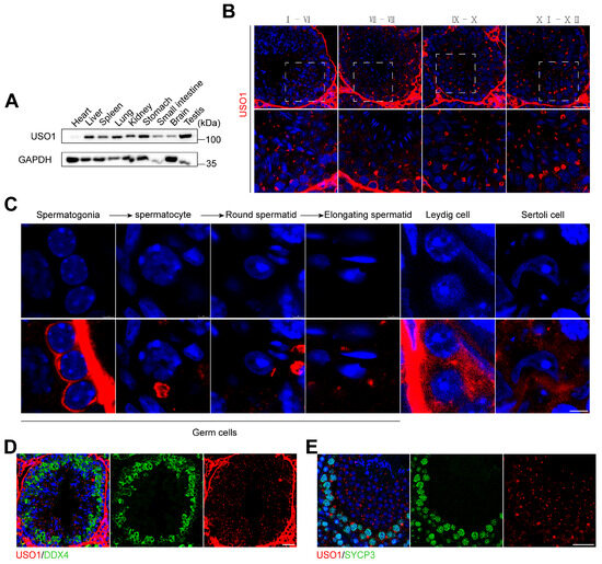 The expression of USO1 in male germ cells. (A) Western blotting was performed on tissue lysates of 8-week-old wild-type mice. Anti-USO1 and anti-GAPDH antibodies were used to analyze USO1 protein levels. (B,C) Immunostaining of USO1 (red) in testes sections prepared from wild-type mice at 8 weeks of age. The nuclei are stained with DAPI (blue). Scale bar = 50 μm. The lower panels show magnified images of single cells from the upper panels. Scale bar = 5 μm. (D,E) Immunostaining of USO1 (red) in testes sections showing DDX4-positive (green) germ cells and SYCP3-positive (green) spermatocytes. The nuclei are stained with DAPI (blue). Scale bar = 30 μm.