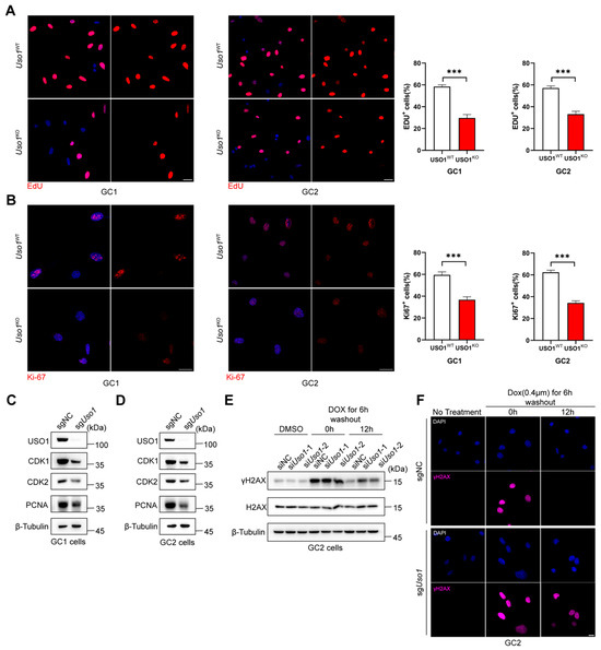 Uso1 knockout represses cell proliferation and impairs DNA damage repair in male germ cells. (A) Proliferation ability was examined using an EdU incorporation assay in GC1 and GC2 cells. Scale bars = 25 μm. The quantitative results are presented in the right panel. Values are expressed as the mean ± SD from three independent experiments (two-tailed Student’s t-test, *** p < 0.001). (B) Immunofluorescent staining of Ki-67 in GC1 and GC2 cells. Scale bars = 25 μm. The quantitative results are presented in the right panel. Values are expressed as the mean ± SD from three independent experiments (two-tailed Student’s t-test, *** p < 0.001). (C,D) The expression of the cell-cycle-associated proteins CDK1 and CDK2, as well as the proliferation-related protein PCNA, were analyzed using Western blotting for GC1 and GC2 cells. β-Tubulin was used as the internal standard. (E) Immunoblot analysis of γH2AX and H2AX in GC2 cells treated with dimethyl sulfoxide (DMSO) or doxorubicin. (F) Immunofluorescent staining of γH2AX in GC2 cells treated with DMSO or doxorubicin. Blue—DAPI, red—γH2AX. Scale bar = 15 μm.