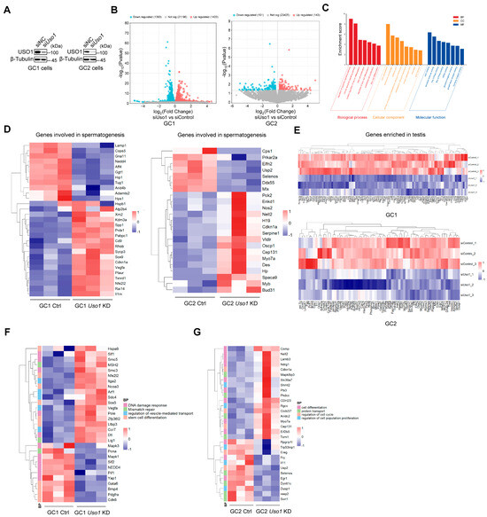 The expression of genes involved in spermatogenesis, including spermatogonial stem cell maintenance [21,22], sperm morphology [23], and fertilization [24], was dramatically changed in Uso1-knockdown cells (Figure 4D). The expression of genes exclusively or predominantly expressed in the testes was substantially diminished in GC1 and GC2 Uso1-knockdown cells (Figure 4E). Furthermore, the expression levels of certain key genes involved in the DNA damage response, mismatch repair, and stem cell differentiation dramatically changed in GC1 cells in the absence of Uso1, and genes related to the known function of USO1 in vesicle-mediated transport also underwent significant changes (Figure 4F). In Uso1-knockdown GC2 cells, genes involved in protein transport, cell differentiation, regulation of the cell cycle, and proliferation were also considerably changed (Figure 4G).