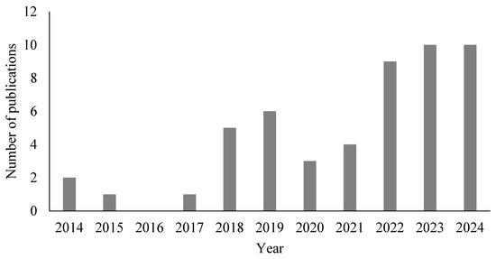 Among the 49 papers selected with the defined inclusion criteria, it was found that the highest publication rates were in 2023 (n = 9) and in 2024 (n = 9). In 2022 (n = 9), followed by 2019 (n = 6), 2018 (n = 5), 2021 (n = 4), 2020 (n = 3), 2014 (n = 2), 2015 (n = 1), 2017 (n = 1), and 2016 (n = 0) (Figure 1). Thus, it is evident that publications in recent years (2022–2024) were prominent, and this may be attributed to the increasing interest in utilizing red macroalgae for producing novel NPs.