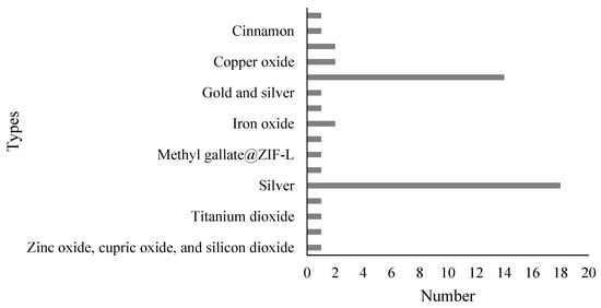 Various materials were utilized as a basis for the development of NPs, highlighting silver (n = 18) and gold (n = 14), followed by copper, copper oxide, and iron oxide (n = 2 each). Chitosan-tripolyphosphate, cinnamon, gold with silver (mix), graphene oxide, metformin-ferrous-ferric oxide, methyl gallate@zif-l, selenium, titanium dioxide, silver with zinc oxide (mix), zinc oxide, and finally, the mix of zinc oxide, cupric oxide, and silicon dioxide were tested once (Figure 2).