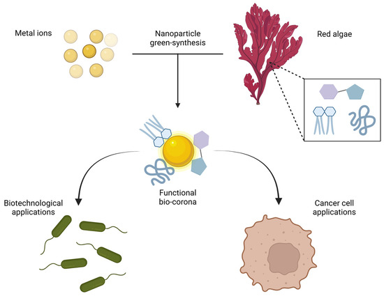 Considering the specificities of algal compounds and the increasing market demand, research on algal-derived nanoparticles (NPs) has grown significantly. This increase is attributed to the unique properties of proposed NPs, which can allow the controlled release of drugs, enhanced bioavailability and effectiveness, and reduce toxicity, among other beneficial aspects [28]. Nevertheless, it should be pointed out that reproducibility is a crucial scientific tenet, in particular, for the biomedical field [29]. The richness of bioactive molecules in algal extracts represents a double-edged sword, counterpoising to the aforementioned potential benefits the risk of a lack of reproducibility concerning the actual composition of the synthetic products and, as a consequence, their bioactivity. Indeed, it should be recalled that the mechanism of action of isolated algal bioactive species (vide supra) is far from being comparable to their nano-immobilized counterparts, in particular if the chemical nature of the bio-corona remains obscure. However, this represents a general issue for all biogenic nanomaterials and probably the main bottleneck hampering their widespread use and their scale-up at an industrial level of production [30]. Thus, in order to take full advantage of these promising biogenic nanomaterials, the correlation between their biological activities and the exact bio-corona compositions needs to be addressed. It is of pivotal importance to fill the gap existing between our knowledge about the composition and the activity of a natural matrix and the control over a designed core-shell nanomaterial fabrication. Anyway, in light of this emerging scenario, the present study aims at exploring the properties and applications of nanoparticles derived from red algae, analyzing their efficacy and their potential for innovation across various industrial sectors. Overall, the pursuit of sustainable and effective solutions, combined with the growing interest in the properties of seaweeds, opens up a range of opportunities for the research and development of new products, which can meet the demands of the contemporary market.