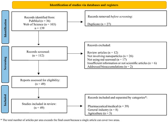 Published articles in the PubMed and Web of Science databases (2014–2024) dealing with nanoparticles produced with red seaweed components for pharmaceutical/medical applications.