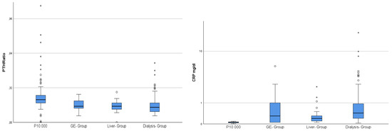 | P10,000 n = 177 | GE-Group n = 33 | Liver-Group n = 29 | Dialysis n = 119 | |||||