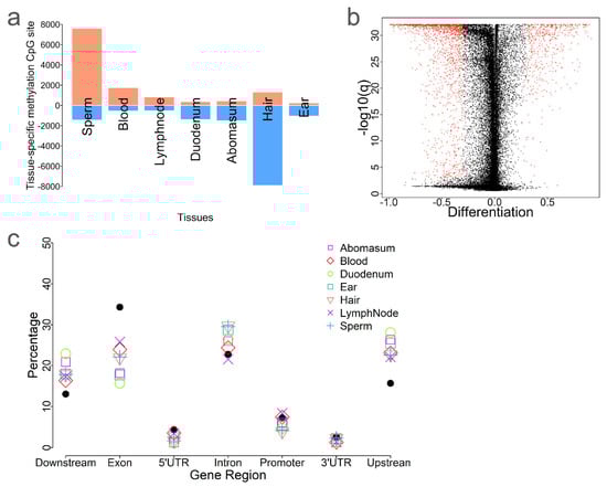 - Zhou, Y.; Liu, S.; Hu, Y.; Fang, L.; Gao, Y.; Xia, H.; Schroeder, S.G.; Rosen, B.D.; Connor, E.E.; Li, C.; et al. Comparative Whole Genome DNA Methylation Profiling across Cattle Tissues Reveals Global and Tissue-Specific Methylation Patterns. BMC Biol. 2020, 18, 85. [Google Scholar] [CrossRef]