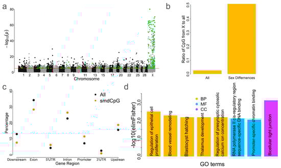 - Maschietto, M.; Bastos, L.C.; Tahira, A.C.; Bastos, E.P.; Euclydes, V.L.V.; Brentani, A.; Fink, G.; de Baumont, A.; Felipe-Silva, A.; Francisco, R.P.V.; et al. Sex Differences in DNA Methylation of the Cord Blood Are Related to Sex-Bias Psychiatric Diseases. Sci. Rep. 2017, 7, 44547. [Google Scholar] [CrossRef] [PubMed]