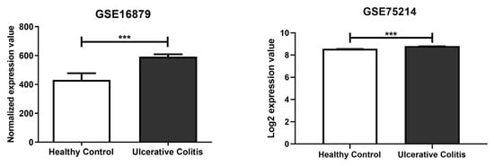 In silico analysis was carried out using two different miRNA prediction tools, namely miRmap (release mirmap_202203) and DianaTools v5.0. This analysis of the mRNA target site located in the 3’ untranslated region (UTR) identified MAP2K1 as the target gene of miR-369-3p (Table S1). Subsequently, to understand whether the expression of MAP2K1 was altered in patients with UC, we analyzed the two public datasets, GSE75214 [] and GSE16879 [], that include 24 and 74 UC patients and six and eleven healthy controls, respectively. In the samples, the expression levels of MAP2K1 were higher in inflamed intestinal mucosa of UC patients compared with healthy controls (Figure 1; p < 0.001).