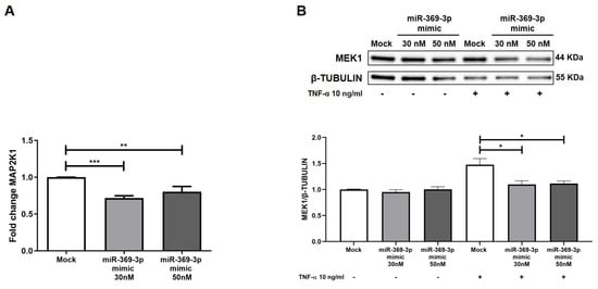 To investigate the potential modulation of MAP2K1 by miR-369-3p, we conducted, in HT29 cells, transient transfection with synthetic molecules of miR-369-3p at the concentrations of 30 nM and 50 nM. We found that the miR-369-3p mimic significantly decreased the MAP2K1 mRNA expression at both miRNA concentrations (Figure 2A; p < 0.01). Next, we examined the effect of transient transfection with miR-369-3p on the MEK1 protein expression levels. In a steady state, the protein expression levels of MEK1 were unchanged at both miRNA concentrations. Since the protein expression of MEK1/2 is affected by TNF-α, that was the most common inflammatory cytokine in IBD [], we evaluated whether miR-369-3p was able to regulate the expression of MEK1 after stimulation with TNF-α. As shown in Figure 2B, the protein expression levels of MEK1 increased after TNF-α administration. However, the intracellular increase of miR-369-3p decreased the expression of MEK1 at both 30 and 50 nM concentrations compared to the treated-mock control (Figure 2B; p < 0.01).