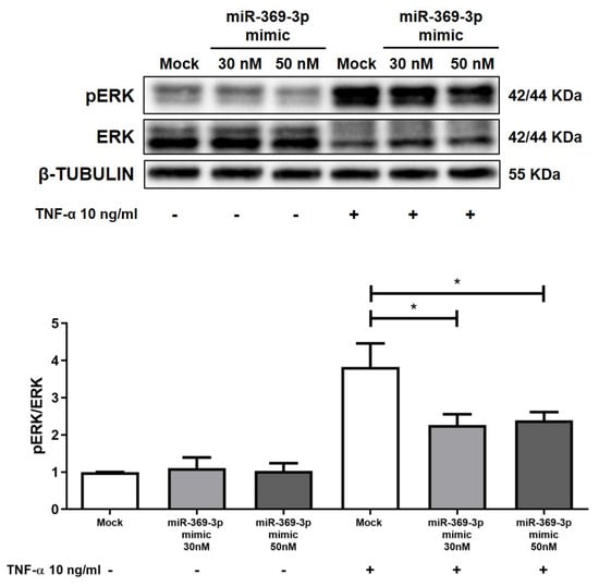Since MEK1 is responsible for the phosphorylation and thus the activation of ERK1/2 [], we further tested the influence of miR-369-3p on the activation of the ERK protein. Western blot analysis revealed that the expression of pERK was poor in HT29 in uninflamed states, whereas stimulation with TNF-α resulted in an overactivation of pERK. Despite this, as demonstrated by the pERK/ERK ratio histogram, the rise of miR-369-3p inhibited the phosphorylation of ERK in TNF-α-stimulated cells at both the 30 and 50 nM miRNA concentrations (Figure 3; p < 0.01).