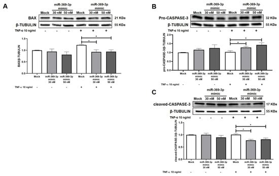 Treatment with miR-369-3p ameliorated the expression of protein involved in apoptosis in HT29 cells. (A) Western blot analysis of BAX protein expression after miR-369-3p mimic transfection in HT29 cells at the 30 nM and 50 nM miRNA concentrations, both unstimulated and TNF-α-stimulated. (B) Western blot analysis of CASPASE-3 protein expression after miR-369-3p mimic transfection in HT29 cells at the 30 nM and 50 nM miRNA concentrations, both unstimulated and TNF-α-stimulated. (C) Western blot analysis of cleaved-CASPASE-3 protein expression after miR-369-3p mimic transfection in the HT29 cells at 30 nM and 50 nM miRNA concentration both unstimulated and TNF-α-stimulated. β-TUBULIN was used as housekeeping protein to normalize the data. Data are shown as the mean ± SEM representative of four independent experiments (* p < 0.05).