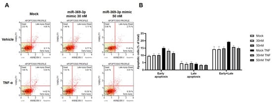 In addition to the protein expression analysis, we evaluated the apoptotic process using the Muse Annexin V & Dead Cell Assay kit. Compared to the steady state, stimulation with TNF-α increased the percentages of apoptotic cells, mainly early on. Despite this, the transfection with miR-369-3p significantly reduced the percentages of apoptotic cells (early and late) at both tested miRNA concentrations compared to the Mock control (Figure 5; p < 0.05).