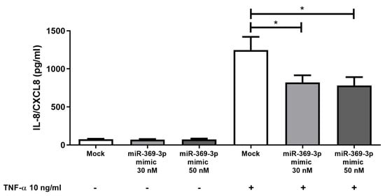 miR-369-3p modulates the release of the pro-inflammatory cytokine IL-8. miR-369-3p mimic transfection in HT29 led to a significant decrease in IL-8 at both 30 nM and 50 nM miRNA concentrations after TNF-α stimulation. Data are shown as the mean ± SEM representative of four independent experiments. (* p < 0.05).