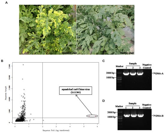 Symptoms shown in watermelon (A) and discovery of squash leaf curl China virus (SLCCNV) in watermelon diseased leaves through next-generation sequencing (NGS) (B) and PCR identification (C,D). (B) The result of scaffold lengths versus (vs.) coverage of all assembled fragments. The first quadrant contains all suspicious sequences with high content > 2 kb and only two fragments in the bottom right corner are high content fragments, both of which are SLCCNV. The “negative control” in (C,D) refers to sample collected from healthy plants in plastic greenhouses.