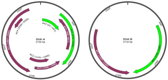 Geminiviruses cause devastating diseases in many economically important crops and economic losses worldwide. The family Geminiviridae, with a total of over 500 species, is classified into 14 genera including Becurtovirus, Begomovirus, Capulavirus, Citlodavirus Curtovirus, Eragrovirus, Grablovirus, Maldovirus Mastrevirus, Mulcrilevirus, Opunvirus, Topilevirus, Topocuvirus, and Turncurtovirus, based on insect vectors, genome organizations, and host ranges []. Begomovirus is a genus with the most species (445 species and 8 unclassified species) []. They exclusively infect dicots, and the genome can be either bipartite, which contains two circular ssDNA molecules, DNA-A and DNA-B [], or monopartite, which contains a single circular ssDNA molecule, DNA-A []. The DNA-A encodes all the proteins required for viral replication and encapsidation, including AV1 (capsid protein, CP), AV2, AC1 (replication-associated protein, Rep), AC2 (transcriptional activator protein, TrAP), AC3 (replication enhancer protein, REn), and AC4. Few begomoviruses encode AC5 []. The DNA-B encodes BV1 (nuclear shuttling protein, NSP) and BC1 (movement protein, MP). DNA-A can replicate autonomously and is responsible for generating complementary-sense (CS) and virion-sense (VS) strands through rolling-loop replication and recombination-dependent replication and producing virion [,]. DNA-B cannot replicate autonomously but is required for systemic infection and symptom development [,]. Monopartite begomoviruses are frequently accompanied by betasatellites, alphasatellites, or deltasatellites, and betasatellites have been confirmed to be associated with symptom induction of the disease [,,]. Begomoviruses are transmitted by whiteflies (Bemisia tabaci) in a persistent circulative manner, and the specificity of whitefly vector is associated with specific amino acid sequences of the viral CP []. In addition, it has been proven that for tomato yellow leaf curl virus (TYLCV), replication occurs not only in the host plant but also in the salivary glands of whiteflies [].